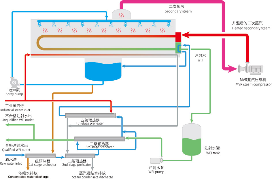 xj星际1277最新研发生产的热压蒸馏水机使用了MVR节能技术,具有产水优质、节能效果显著、安装使用灵活等优点。xj星际1277热压蒸馏水机产量可从1T/h至100T/h[1],既可为客户提供大处理量中心式制水方案,基于其超低的产量范围和撬装模块化设计,也可为客户提供灵活的分布式注射用水生产解决方案。